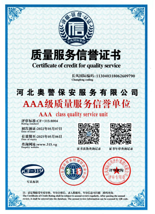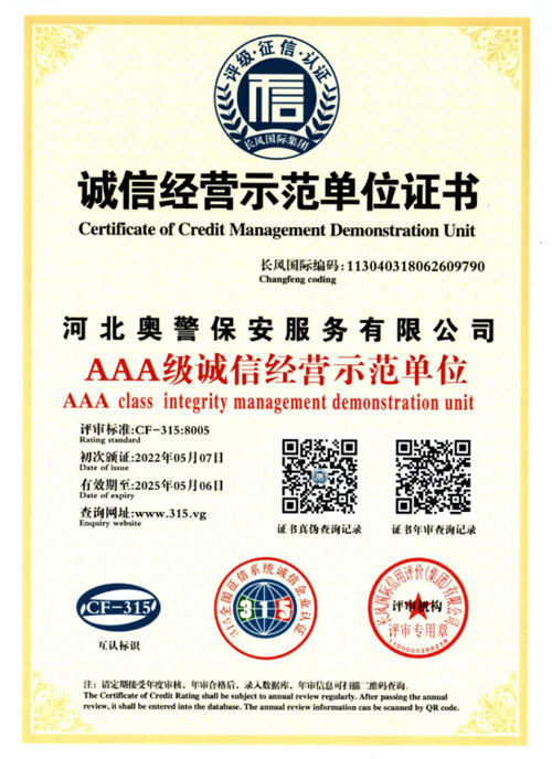 河北奧警保安服務有限公司成立于2017年7月20日,注冊資金1000萬元,具有中華人民共和國《保安服務許可證》(編號:冀公保服20180085)的綜合性安保企業。
